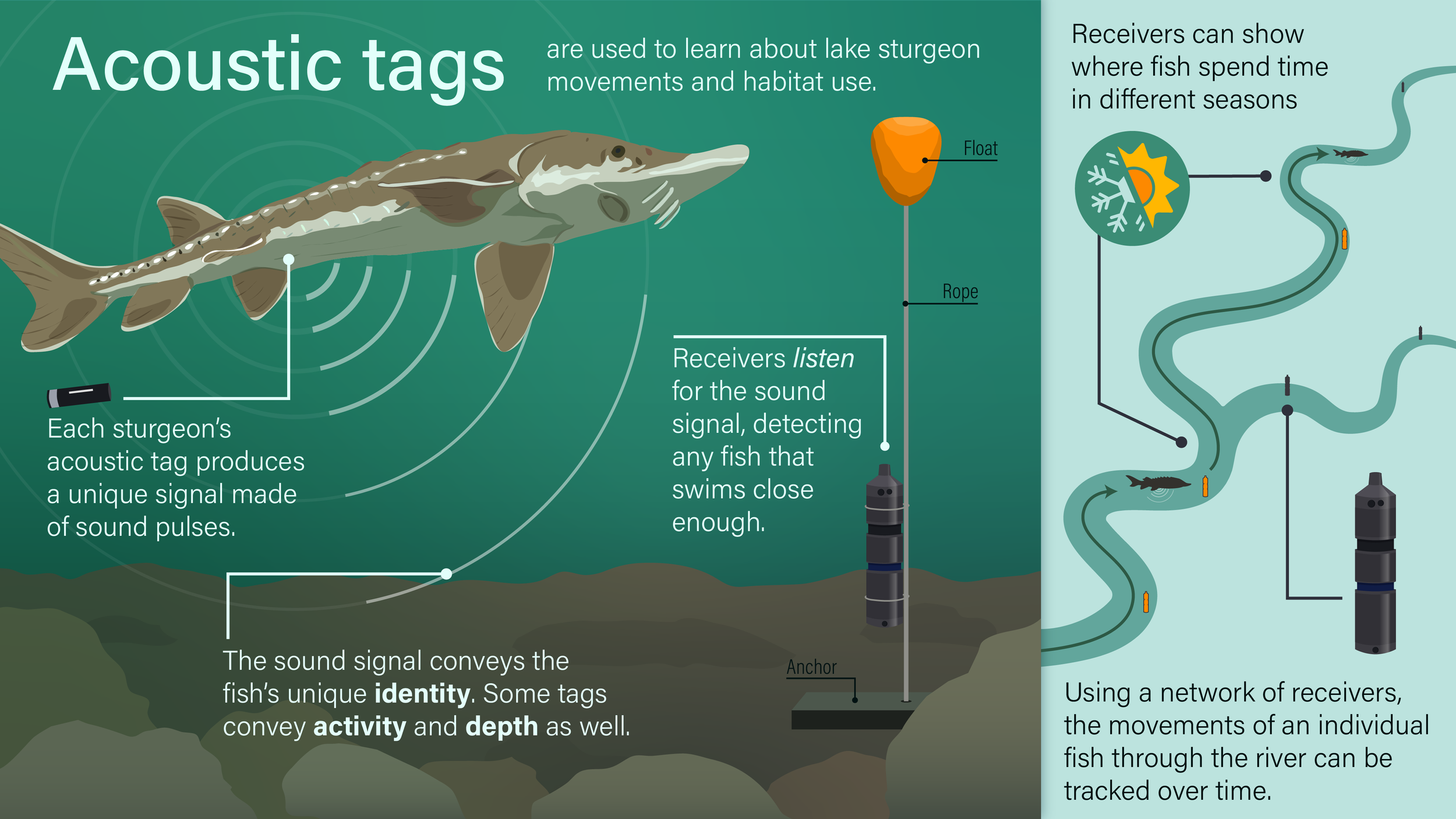 Using acoustic telemetry (see image below), with tags gently implanted by our team in some namewak, we can learn about their winter movements and the habitats they rely on during the coldest months.
