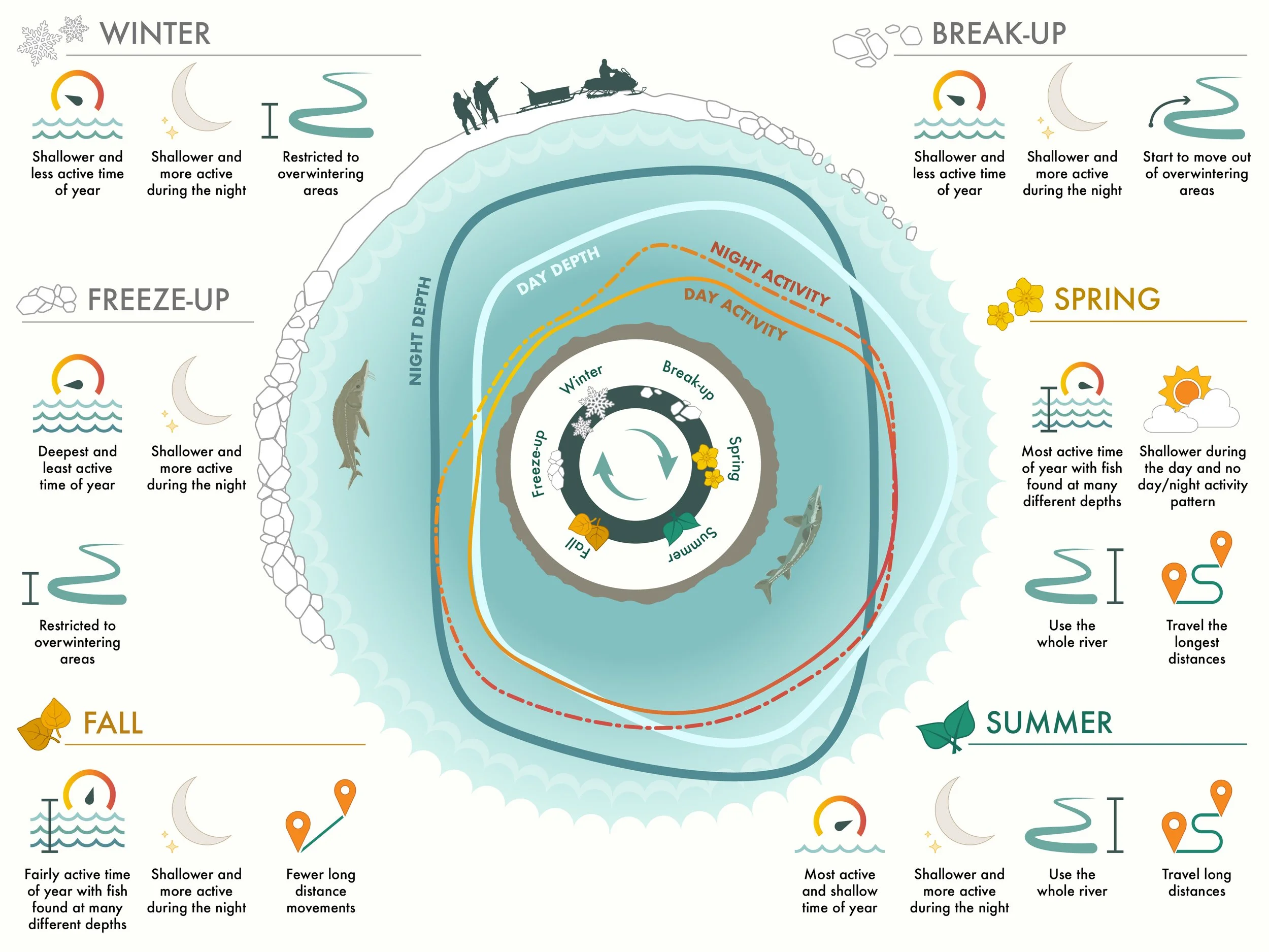 In the below image, you can explore what we learned from namewak in the North French River and see how their movements and behaviours change throughout the year.